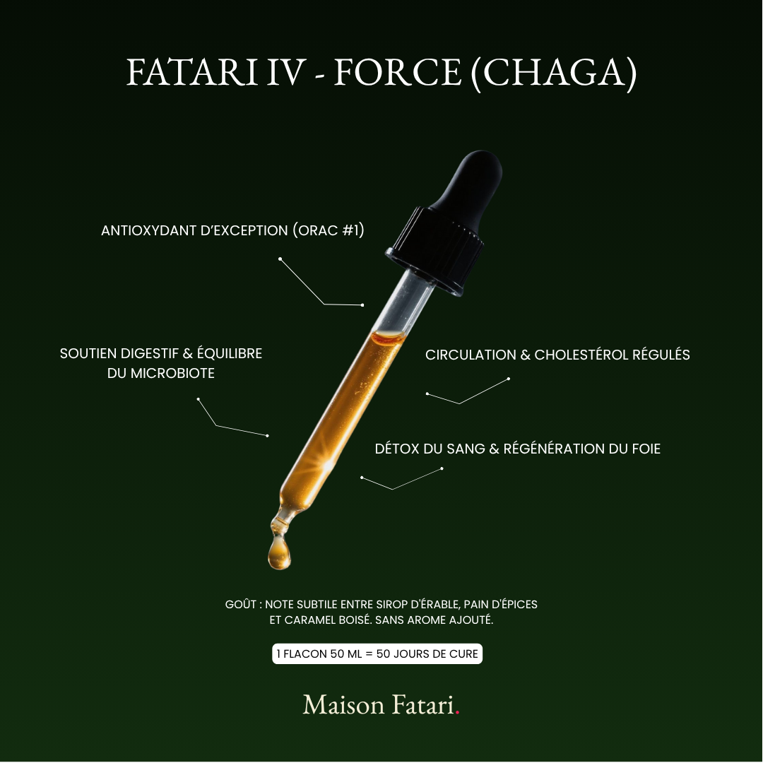 Le Chaga est classé n°1 sur l’échelle ORAC, bien loin devant les baies de goji ou le thé vert. C’est une forteresse contre le vieillissement cellulaire, l’oxydation et les inflammations chroniques. Nous avons conçu Fatari IV pour honorer cette puissance, sans la diluer ni la masquer.
