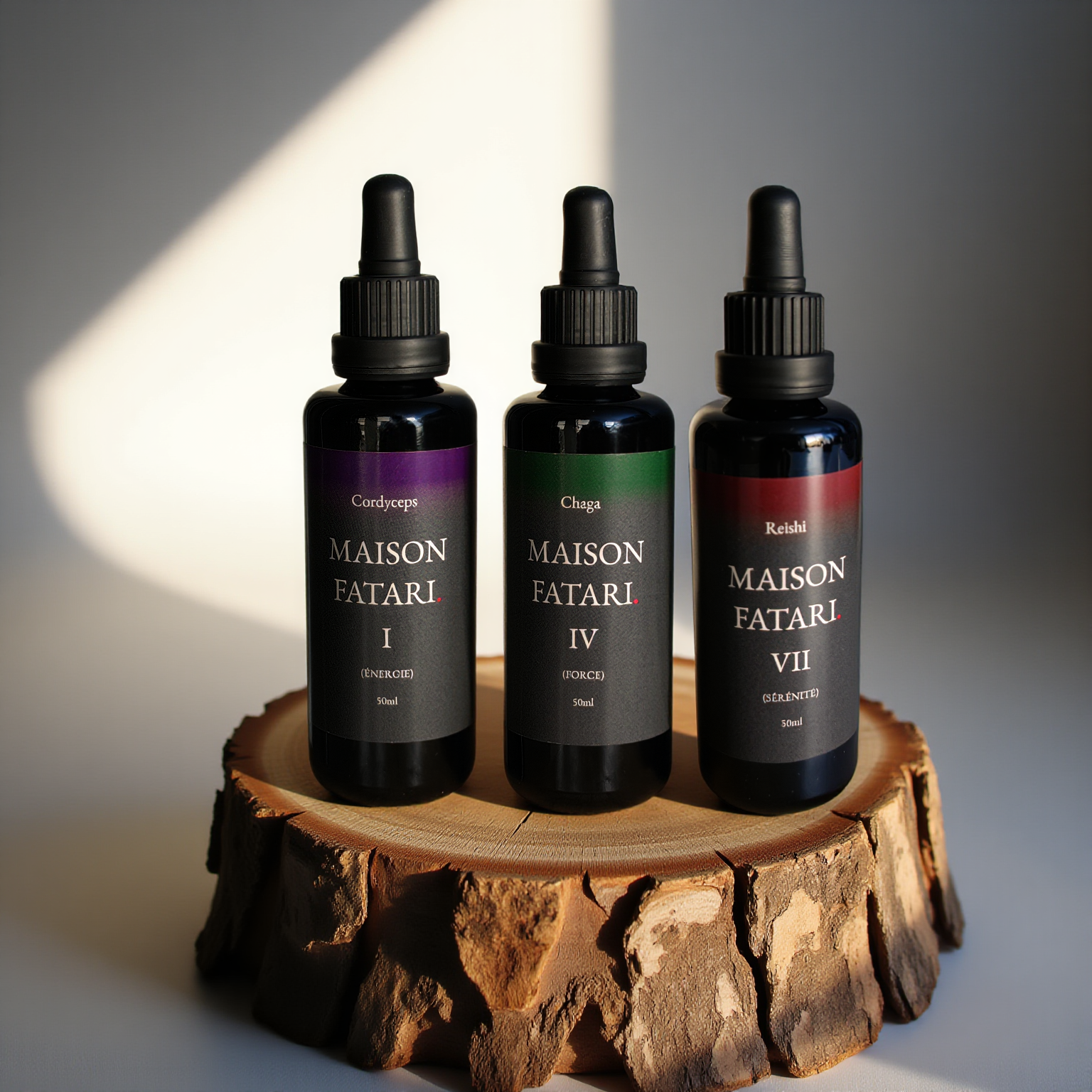 - 3 flacons d’extraits liquides (Reishi + Chaga + Cordyceps)